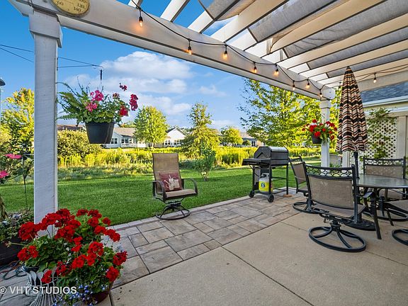 Premium location for this beautiful "Montrose" model home. Hardwood floors throughout. Kitchen appliances new in 2018. Den with built in desk and cabinets on both sides of room. Built in cabinets added to primary bedroom closet. Extended patio with pergola and tarp for the sunny days and lights for either relaxing or entertaining outside in the evening. All that in an active 55+ gated community that provides lawn care and snow removal. Lodge has indoor and outdoor pool, hot tub, fitness center, pool table, craft room and too many clubs and activities to name. Truly a great community! OPEN SUNDAY 12:30-3:00