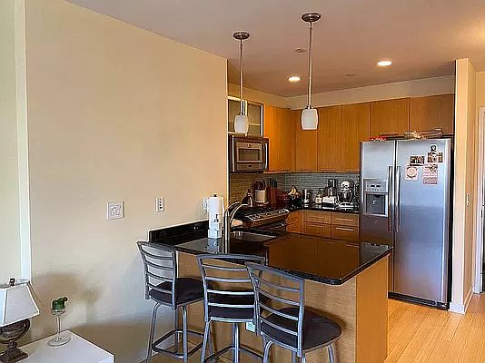 The open chef's kitchen features high-end stainless steel appliances, while the kitchen island stylishly borders the kitchen with the living room. The large size bedroom, comes with ample closet space.