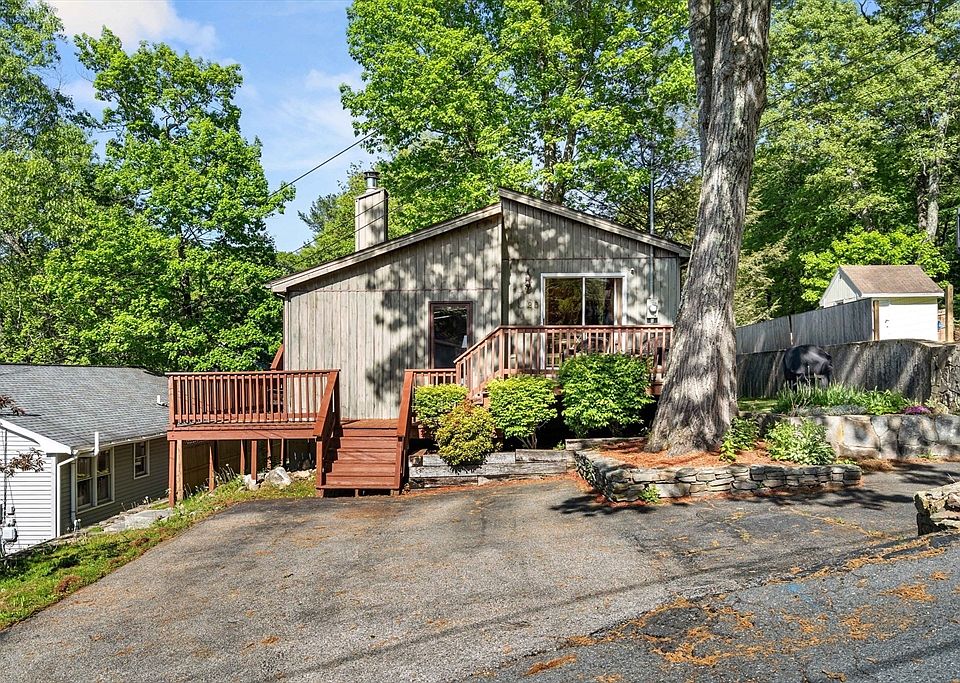 MULTIPLE OFFERS RECEIVED. HIGHEST & BEST BY FRIDAY, MARCH 29TH 6:00 PM. Open-concept kitchen/dining room, adorned with hardwood floors & slider leading to a wrap-around deck. Perfect for enjoying meals while soaking in the scenic views. Relax in the sunken LR featuring a cozy wood fireplace, offering warmth & ambiance on chilly evenings. Enjoy views of the lake through the picture window. 3 spacious bedrooms, 2 of which offer views of the lake. Each bedroom is equipped with mini-split systems. Full tiled bath & laundry on the first floor provide convenience & functionality. Discover added living space in the newly finished basement, featuring vinyl flooring, recessed lighting, and ample storage options, ¾ bathroom and slider to the side yard add versatility to this space, perfect for recreation or relaxation. Embrace the outdoors with plenty of yard space for gardening or entertaining.