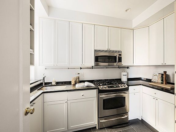 An entry foyer opens to a generous corner living room, perfect for both relaxing and entertaining. The adjacent windowed kitchen is beautifully outfitted with granite countertops, abundant cabinetry, and premium stainless steel appliances by Miele, Liebherr, and GE Profile.