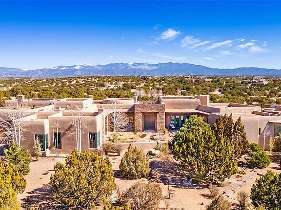 DYNAMIC AND CAPTIVATING MOUNTAIN VIEWS FROM THIS STUNNING LAS CAMPANAS ESTATE SITED HIGH ON A PRIME ELEVATED LOT AT THE END OF A TRANQUIL CUL-DE-SAC. This stunning estate captures the essence of Santa Fe living at its finest. Set on just over three acres, with sweeping views of the Sangre de Cristo mountains from every major room, the property offers a rare sense of privacy and luxe living. A beautifully landscaped courtyard welcomes you, with the soothing sound of water features and striking Anasazi stacked stone columns setting the stage for what awaits you inside. Enter through impressive tall wooden entry doors, and the mountains unfold before you - framed by warm wood and hand-detailed features. Traditional vigas stretch across the ceilings, while soft diamond plaster walls glow in the changing light of the day... With eight fireplaces throughout, the home feels both elegant and deeply comforting. Designed for effortless living and entertaining, the main house features formal and informal living and dining areas, a chef's kitchen with high-end appliances, and expansive counters. The home easily spans inside and outside areas - perfect for soaking in Santa Fe's breathtaking sunsets. The owner's suite is a retreat of its own, opening to the front courtyard and a private covered portal. A cozy sitting room, an oversized spa-like bath, and a custom walk-in closet set the tone for this personal sanctuary. Across the courtyard, the guest house offers a private space with its own bedroom, bath, and all the warmth of the main home. And when the moment calls for something truly special, the rooftop terrace offers a front-row seat to Santa Fe's endless vistas. Tucked just out of sight, the oversized yet discreet three-car garage keeps the home's approach pristine, allowing its timeless beauty to shine. This is more than just a home - it's an experience, a place where traditional Santa Fe charm meets refined comfort in the most effortless way.