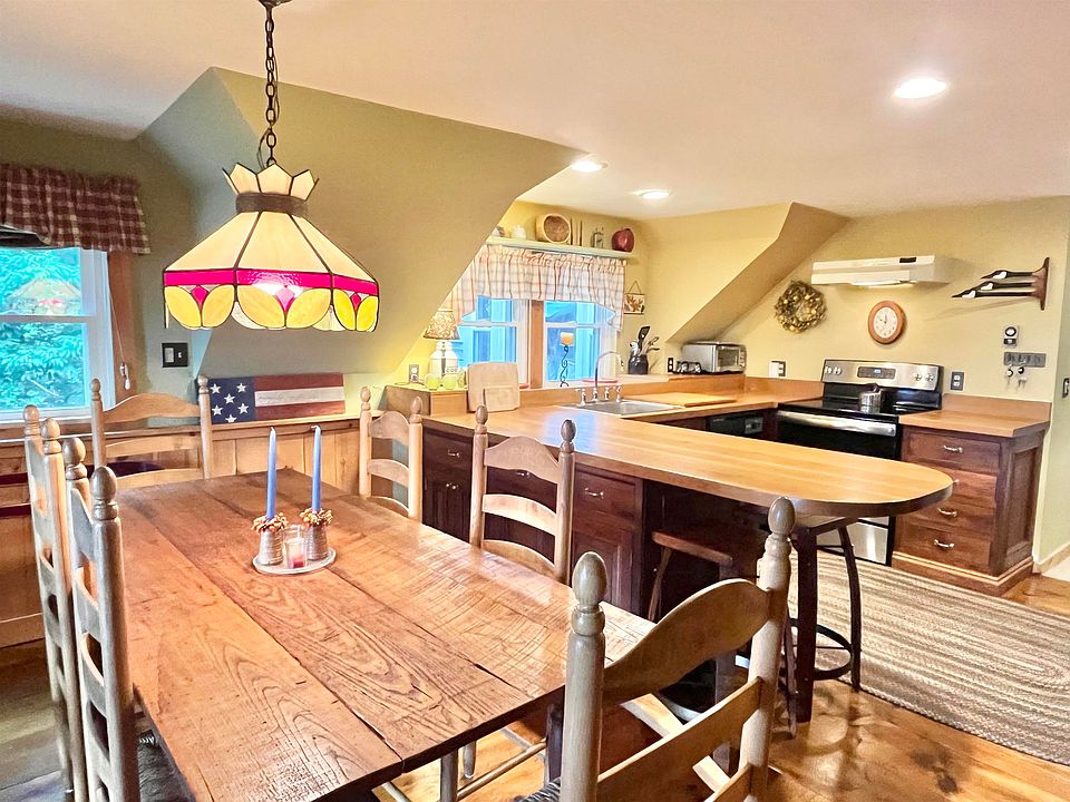 Rarely do you find a 2 bedroom, 2 bath condominium with character, history & rustic charm. From the custom made walnut kitchen cabinets, wide plank pine flooring, farmhouse barn-style doors throughout to a beautiful view from your living, dining and kitchen you'll feel right at home. Primary bedroom features vaulted ceilings and a picture window. Nicely appointed furnishings. Enjoy watching or playing tennis in Apple Hill's private tennis courts with a country setting as well as being close to all the summer activities offered in the Valley including music festivals, fishing, hiking, dining, shopping and a skip and a hop from the trails of Mount Snow for world class skiing. Winter views of Mount Snow. This sought out Apple Hill property was the 1878 Roosevelt's family home that was converted in 1980 to 4 condominiums.