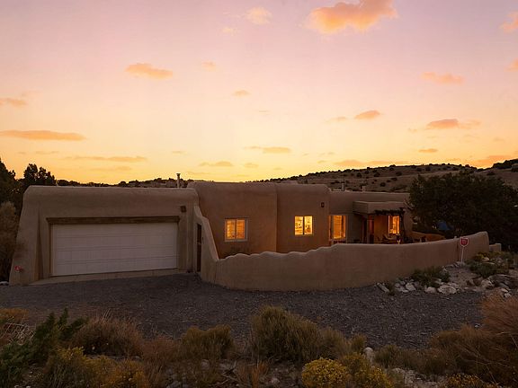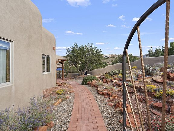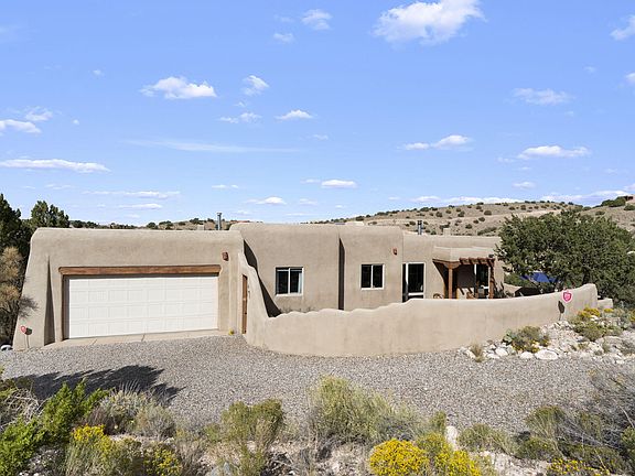 Welcome to an impeccably cared for home! This southwest-style home offers the perfect blend of the southwest design, capturing the landscape and stunning mountain views on 2.53 acres in Placitas, NM! Warm earth tones complement beautiful vigas and beamed ceilings throughout. Interiors are accented by brick flooring throughout, offering durability, aesthetic charm, and a cool surface in warmer months. The updated kitchen features cherry cabinetry, tile backsplashes, a farm sink, and honed granite countertops. The breakfast bar is finished in polished mahogany for a warm, artisanal touch. The living room features a masonry kiva fireplace with bancos, creating a natural focal point and cozy gathering space.