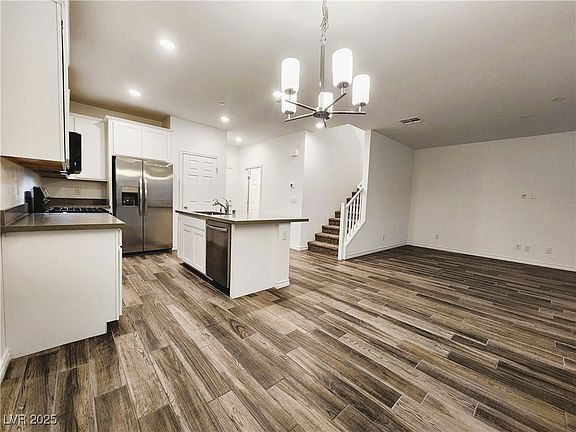 Built in 2022 and lightly lived in, this like-new gated two-story townhome offers 3 bedrooms, 2.5 bathrooms, and a functional open floorplan. The kitchen features a large breakfast bar island and new stainless steel appliances. The primary suite includes a bathroom with separate shower and soaking tub. A covered patio is located just off the dining area. Full 2-car attached garage with ample storage space. Resort-style community pool. Conveniently located near schools, restaurants, shopping, and amenities with easy access to the I-15 freeway - minutes to all the best of Las Vegas!