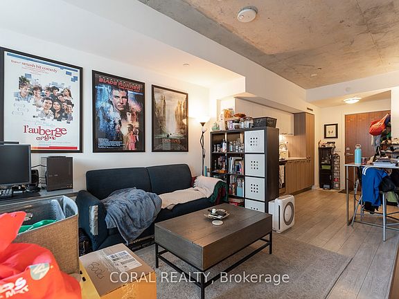 Welcome to Riverside Square where urban energy meets modern comfort. This bright and functional 1-bedroom plus den suite features a west-facing view, flooding the space with natural light. The open-concept layout is perfectly designed with engineered hardwood floors throughout, cabinetry-matched integrated appliances, and a spacious living area that opens to a private 70 sq.ft. balcony. The den offers flexibility for a home office or reading nook, while the bedroom includes generous closet space and sliding glass doors.Enjoy 9-ft exposed concrete ceilings that give the suite a contemporary loft-like vibe. The building offers premium amenities including a rooftop pool and sundeck with city skyline views, fitness centre, party lounge, guest suites, and 24-hour concierge. Located in one of Toronto's most vibrant neighbourhoods, Queen East & Broadview, with cafes, restaurants, and shops at your doorstep and quick access to DVP, TTC, and the Don River Trail.