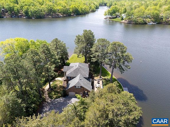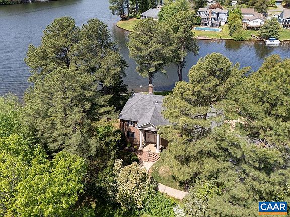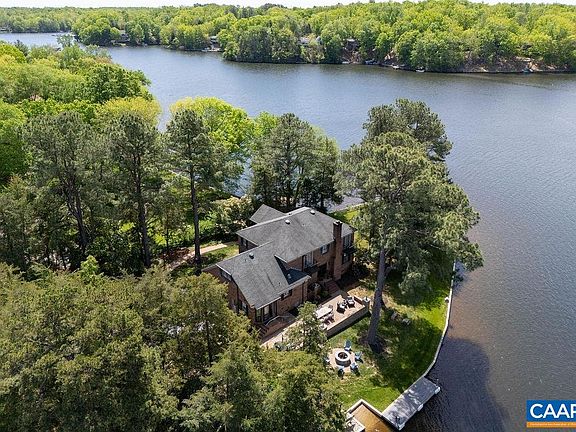 ENJOY SUMMER ON THE LAKE. Welcome to your dream waterfront property in Lake Monticello! Perched on a spectacular peninsula with over 300 feet of prime lake frontage, this updated home offers an unparalleled 180-degree water panorama that will take your breath away. Recently renovated with modern updates throughout, including a beautifully reimagined kitchen, primary suite & baths. A rare offering with a nearly level 1/2 ac lot that gently slopes to the water's edge. Newly rebuilt bulkhead ('24) provides sturdy protection, while your private dock awaits for easy boat access. Entertaining is a delight on the expansive patio, where gatherings naturally flow between indoor & outdoor spaces. Enjoy evenings around the fire pit while the sky transforms with vibrant sunset colors reflected across the tranquil lake surface. A quick 0.4 mi to main gate & clubhouse, 2.5 mi to shopping, & 15 mi to Downtown Charlottesville.