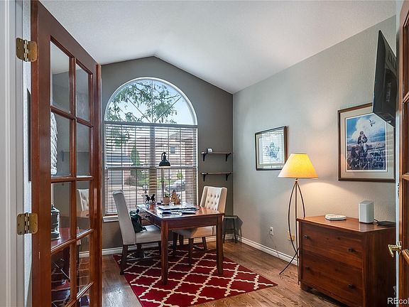 - Description: French-Style Doors, Wood Floors, Large Windows, Vaulted Ceiling, Blinds, Shelving, Mounted Tv