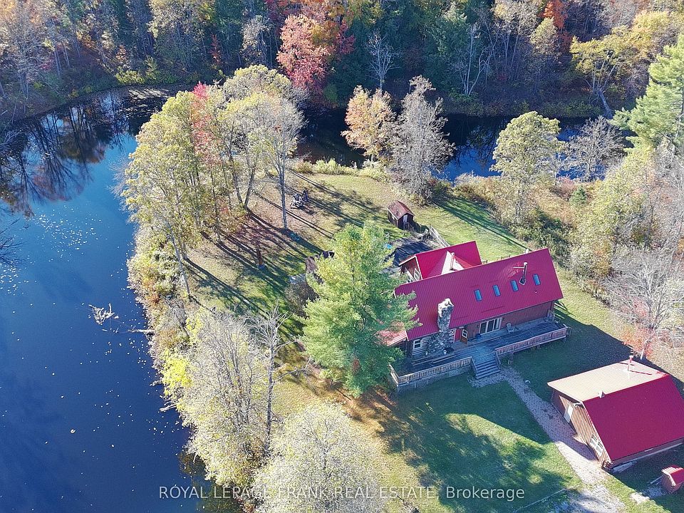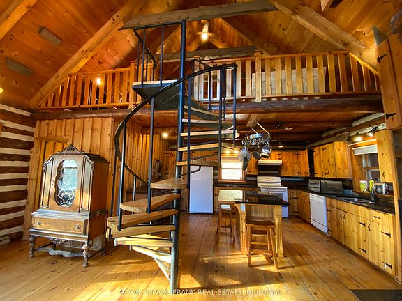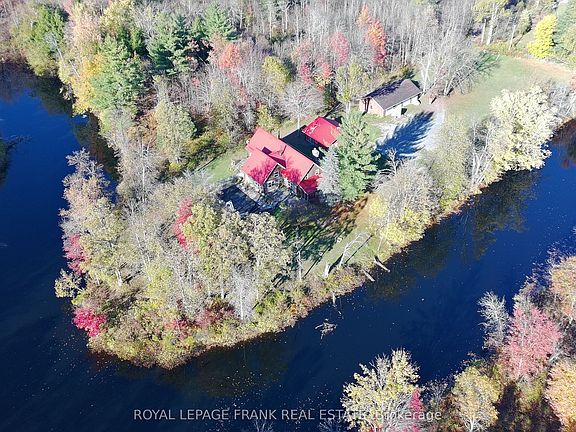 A truly remarkable, handcrafted log home that feels like a luxurious waterfront lodge straight from a movie set! Nestled on just over 2 private acres, this pine-beamed masterpiece features massive log construction, 4 spacious bedrooms, and 3 bathrooms. Unique architectural touches include three staircases and two loft spaces that overlook the expansive kitchen/dining area and the stunning Great Room below. The breathtaking vaulted ceilings soar to 20 feet, enhanced by skylights that flood the space with natural light. This four-season sanctuary also offers a striking stone fireplace, two additional woodstove hookups, beautiful pine plank flooring, and a fully finished basement. With 700 feet of water frontage along the Skootamatta River wrapping around the property, you'll enjoy panoramic views and exceptional privacy. Relax in the fully enclosed sunroom overlooking the inground pool, or take advantage of the detached four-car garage in the process of being re-shingled. An added bonus? A separate 800 sq.ft. living space with open-concept layout, kitchen, laundry, and bathroom, all finished in warm pine and wood tones, ideal for guests, in-law suite, or short term accommodations. Immediate possession available.