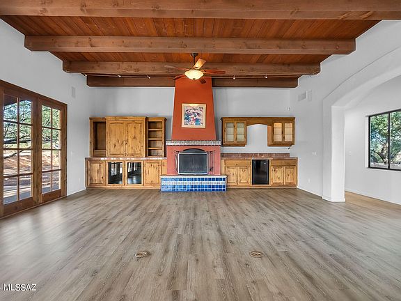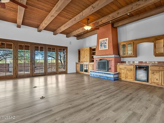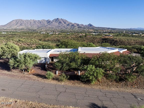 Offering 5.5 acres of pristine privacy, luxury and tranquility and featuring panoramic views of the Santa Cruz Valley, this spacious ranch-style home offers top-of-the-line finishes. Dramatic design elements include exposed plank-and-beam ceiling, architectural arches, wood-burning fireplace. Walled courtyards provide room for outdoor entertaining and multiple seating areas, built-in grilling station. Kitchen features alder wood cabinetry, Rojo Alicante marble tile accents, walk-in pantry, instant hot water, reverse osmosis system. Primary retreat features spa-like en suite bath; private guest suite offers plenty of space for visitors or multi-gen households with bedroom, full bath, kitchen, private terrace. Oversized two-bay garage plus flex room is ideal for office, art studio, workshop