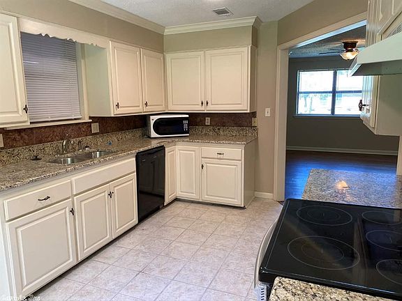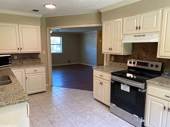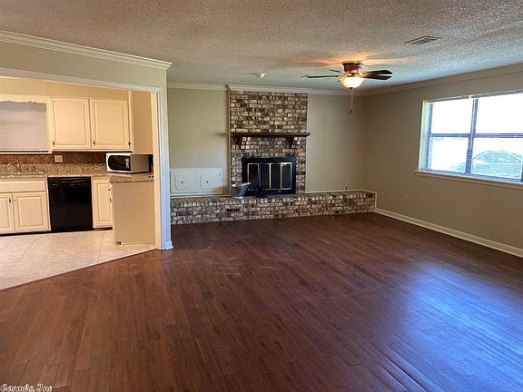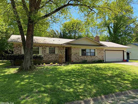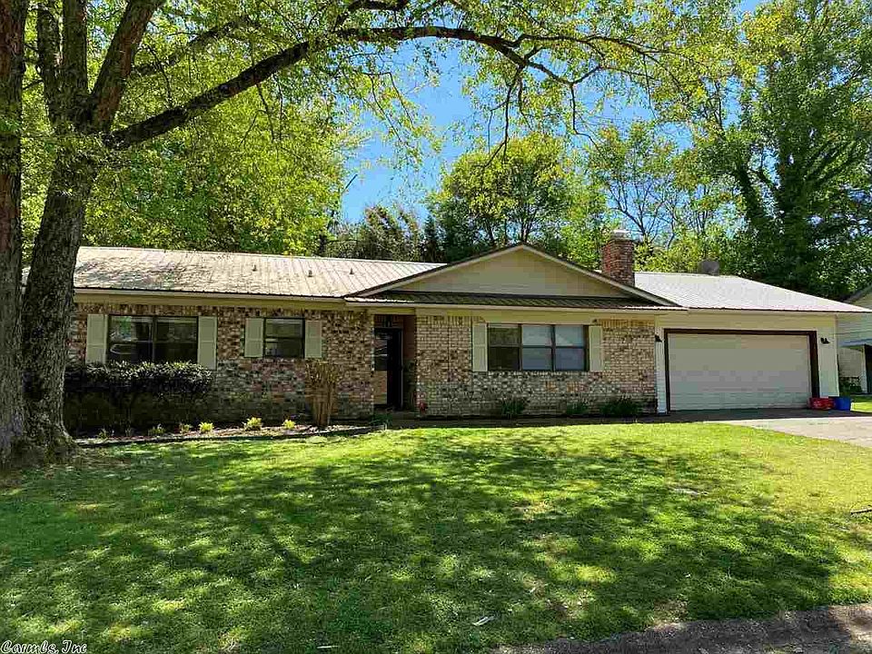 Large open living and dining space with a brick wood-burning fireplace. Large bedrooms with carpet. Master bath has step-in shower, recently updated. New metal roof in 2017. New granite countertops in kitchen and hall bath 2020. New kitchen stove. New lighting. New siding around garage area. Large two-car garage, fenced backyard with small metal storage building. Wooded area behind this lot. Refrigerator included.