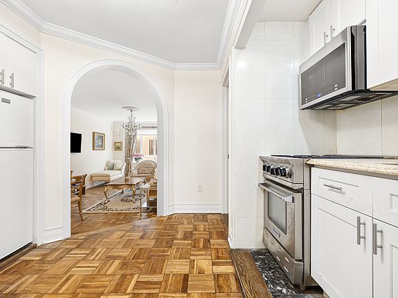 Northern and eastern exposures flood the space with natural light. The hardwood floors shine. Crown moldings add character. Chandeliers and fixed lighting elevate the ambiance. The windowed bathroom is classic and bright. The kitchen? Sleek and modern, with stainless steel appliances, marble countertops, a wine cooler, and generous cabinetry for all your culinary needs.