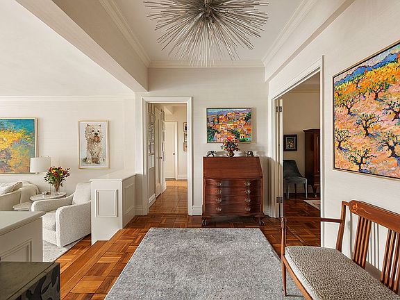 Highlights include a curated selection of designer lighting treatments by Kelly Wearstler, a complete repainting of the residence, and custom Philip Jeffries Vinyl Silk and Abaca wallpaper in the entryway and living room. The kitchen has also been updated with premium stainless steel appliances. Earlier renovations introduced custom built-ins, painting, and electrical work, further elevating the home’s functionality and style. Designer lighting fixtures include a Kelly Wearstler Utopia medium 5-arm chandelier, Strada medium oval chandelier in burnished silver leaf, and Strada flush mount in burnished silver, as well as Aerin Serein globes in polished nickel in the kitchen and hallways. The second bedroom includes a Brigitte chandelier in heritage brass—all thoughtfully chosen to complement the home’s pre-war elegance with a modern sensibility.
