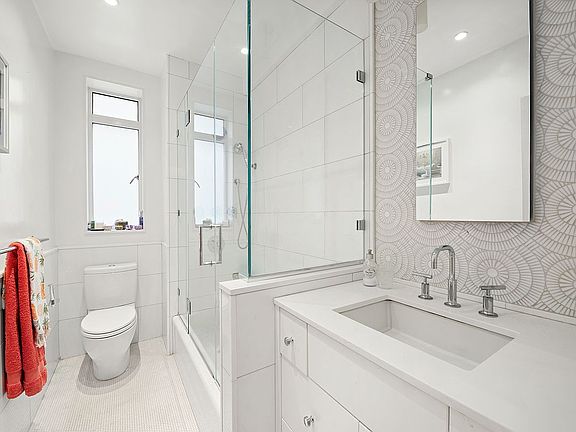 The large and tranquil corner bedroom, also facing south onto the beautiful gardens, easily accommodates a king-sized bed and additional furniture and seating and features a large, outfitted closet. The renovated, windowed bath boasts white tile floors and a stunning tile motif accenting the vanity creating a luxurious, spa-like feeling.