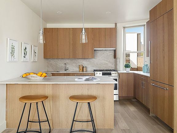 Completely gutted and rebuilt with meticulous attention to detail, the home features a reconfigured layout that maximizes light and functionality, along with new plumbing, full electrical service, and upgraded systems throughout. The kitchen pairs beauty with performance, showcasing Bosch appliances, custom wood veneer cabinetry, and Quartzite Naica stone counters and backsplash. The bathroom was rebuilt with Kohler fixtures and elegant finishes.. Terra Legno engineered wood floors run throughout, complemented by Robert Abbey and Hinkley lighting. An in-unit washer and dryer add modern convenience to this thoughtfully restored pre-war residence.