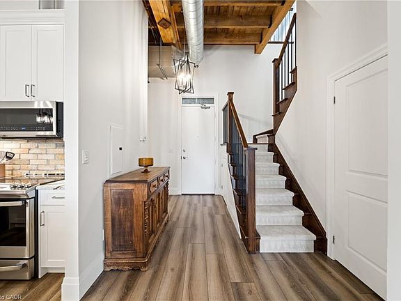 Discover unparalleled luxury in this stunning penthouse loft, offering a rare combination of soaring two-storey ceilings and oversized windows that flood the space with natural sunlight while capturing breathtaking river views. Authentic original wood beams and striking stone walls evoke a sophisticated NYC vibe, infusing the home with timeless elegance and character. Designed for grand living and effortless entertaining, the expansive open-concept layout easily accommodates a full living room set andfull-sized dining table with sideboard - no compromise on space here. The fully renovated chef’s kitchen is a showstopper, featuring quartz countertops, seating for six at the impressive breakfast bar, abundant custom cabinetry, and a walk-in pantry providing exceptional storage.Step outside to the Grand River, where you can enjoy serene walks along the water’s edge or simply unwind by the riverbanks—an incredible extension of your living space.Upstairs, retreat to a lavish two-room primary suite complete with a cozy sitting area, walk-in closet, and serene river vistas. A spacious second bedroom and a versatile den—ideal for a stylish home office—complete the upper level. Enjoy the exceptional convenience of two side-by-side parking spaces, a rare luxury, although you may never need your car in this vibrant, walkable community. Don’t miss this unique opportunity to own an authentic loft that masterfully blends historic charm with modern sophistication—and exclusive riverfront living.