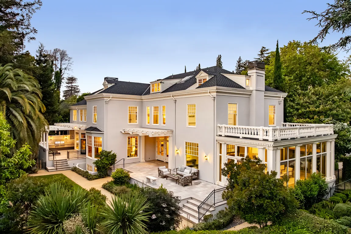 A circular drive leads to an elegant portico framed by Doric columns. Inside, a dramatic foyer with 20-foot ceilings and walnut floors sets a tone of timeless sophistication. The formal living room features a grand wood-burning fireplace, while the adjoining dining room opens to a deck overlooking the gardens. The sunroom, ...