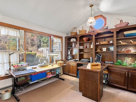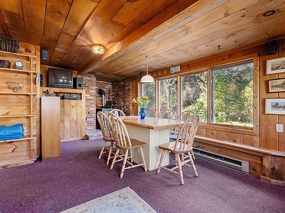This house offers just over 2,000 sq ft of living space with 3 bedrooms and 2 bathrooms. The charming exterior is complemented by a spacious lot surrounded by abundant greenery, creating a scenic wooded setting. The layout is designed with thoughtful consideration, providing ample storage and natural lighting. The interior features a spacious kitchen with abundant cabinetry, allowing for ample storage and meal preparation. The open floor plan with the wood burning stove, contributing to the home's warm and welcoming ambiance. The primary bedroom is on the main level featuring a walk in cedar closet. The home's living spaces are designed for comfort and functionality, with a layout that allows for ample seating and a sense of openness. The second floor features a large bathroom with a soaking tub, shower, sky light, deck and a kitchenette. The mature landscaping and ample parking on the property with a 2-car detached garage and workshop.