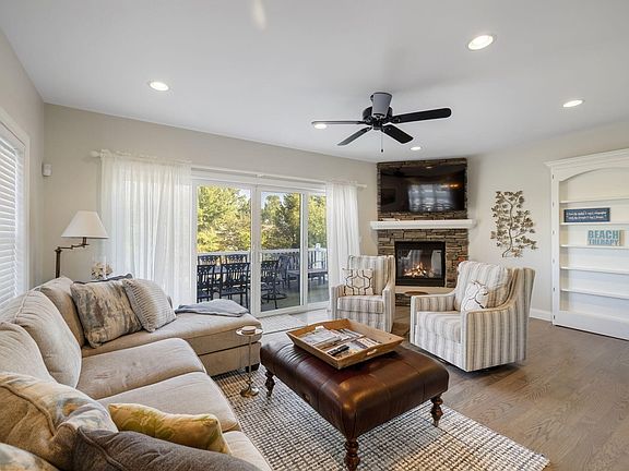 This beautifully renovated end-unit condo offers approx 2,000 sq. ft. of living space across three levels, bright and airy with ample natural light with windows at every turn and featuring 3 bedrooms and 3 full baths. The open-concept main floor includes an inviting living area with a gas fireplace, hardwood floors, and a modern kitchen with granite countertops and stainless-steel appliances. Two ensuite bedrooms feature walk-in showers and private balconies. The expansive rooftop deck showcases panoramic views of Lake Michigan—ideal for sunset watching or summer fireworks.