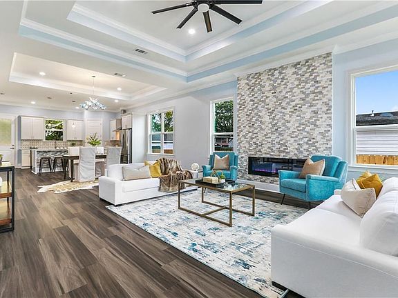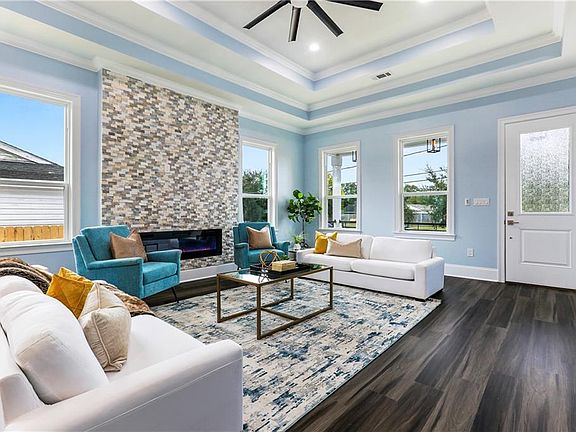 This home is a showstopper! Spectacular Classic New Build featuring open floor, high ceilings, natural lighting throughout, trey ceilings, vinyl floors/waterproof, custom bar area & gourmet kitchen, oversized island w/ Brazilian marble countertops. Luxurious master en-suite, dream walk-in closet, stand up shower & soaker tub. Travertine stone on porch and deck area, paved driveway & patio for lounging. Energy efficient; tankless WH, spray foam and subsurface drainage. Qualifies for 100%Finance. Flood Zone X