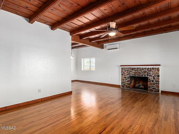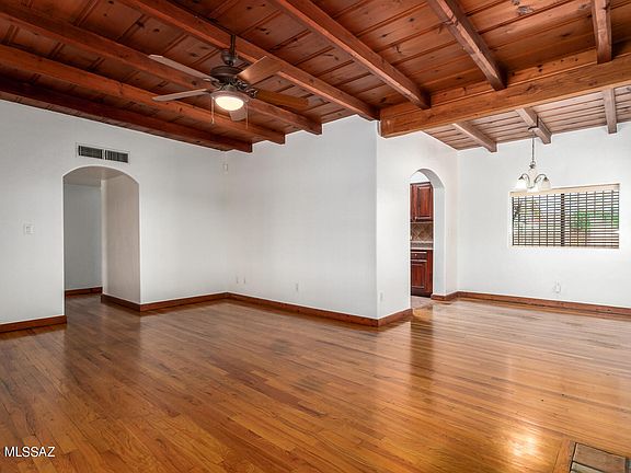 This classic Tucson home has a rustic-inspired interior that boasts exposed beams, freshly painted walls, hardwood flooring, ceramic tile, graceful archways, and a cozy fireplace. No carpet. The spotless kitchen features stainless steel appliances, ample counter space, a stylish tile backsplash, cherry wood cabinetry, recessed lighting, and a skylight that fills the space with natural light. The home includes three well-sized bedrooms, with the primary bedroom offering a private bathroom and a walk-in closet. This home is move-in ready and is solar equipped. Come see it and make an offer today.