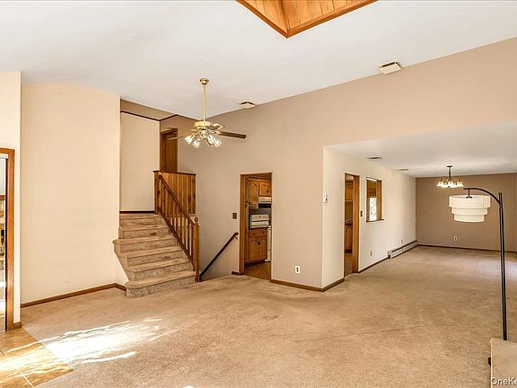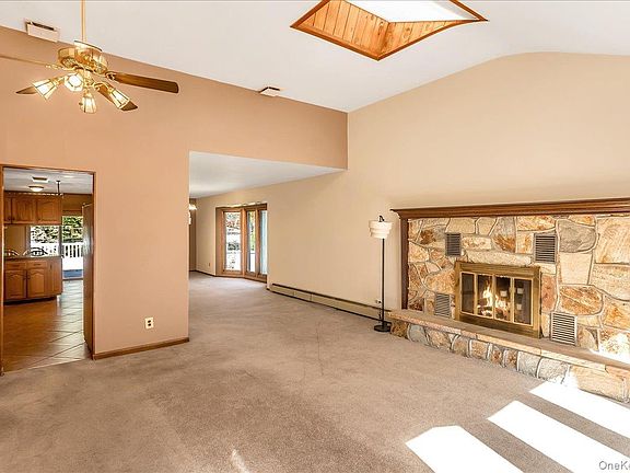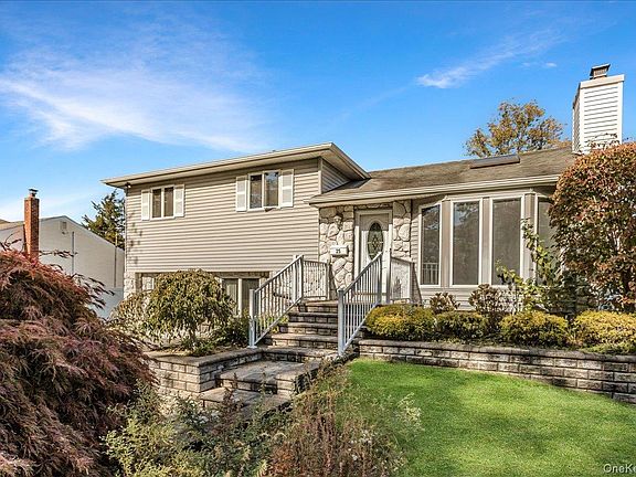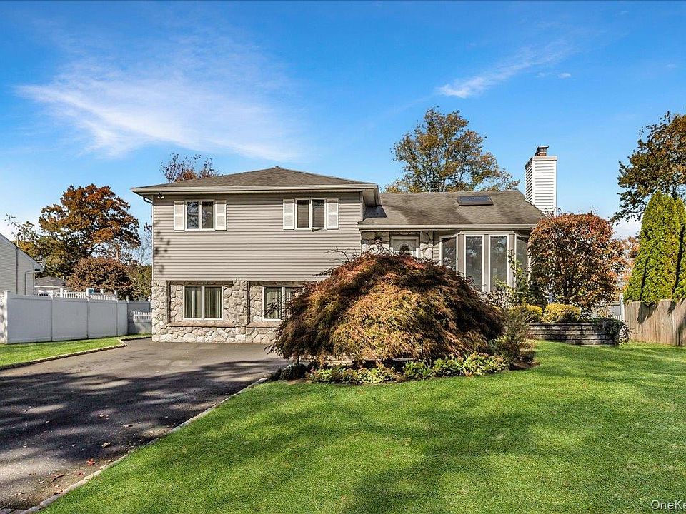 Welcome to this 4-bedroom, 2-bath split-level high ranch set on a quarter-acre lot in Smithtown. With vaulted ceilings, skylights, and south-facing exposure, natural light fills the home from morning to evening. The entry opens to a large living room with bay window, connecting seamlessly to a spacious dining area and updated eat-in kitchen that features recessed lighting and sliding doors to a raised deck - perfect for indoor-outdoor entertaining! Upstairs offers three well-sized bedrooms with exposed hardwood floors and a Jack-and-Jill full bath shared by the primary bedroom and hallway. The lower level includes ground-level backyard access, a second living space or den, plus an additional bedroom and bath. The finished basement adds even more versatility with a recreation area and separate utility/storage room. The expansive backyard and multi-car driveway complete this bright, inviting home that’s been thoughtfully updated and ready for your finishing touches.