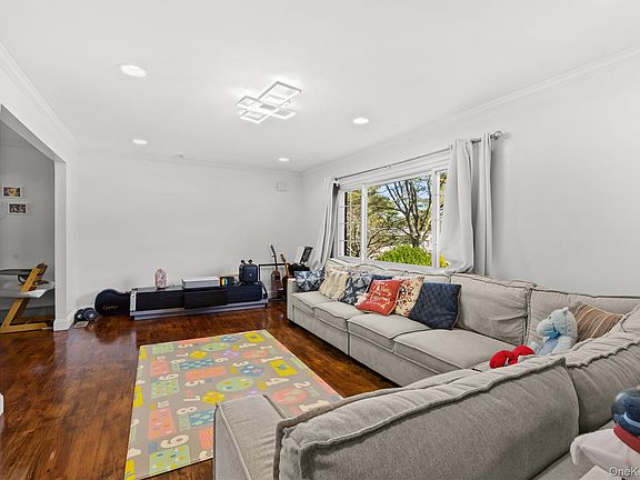 This spacious 4-bedroom home features an inviting entrance foyer, bright living room, formal dining area, and a large eat-in kitchen that opens to a beautiful backyard—perfect for entertaining. The cozy family room with fireplace offers warmth and charm, while hardwood floors throughout add timeless elegance. Upstairs, generous bedrooms include a primary suite with walk-in closet and treetop views. The finished basement provides flexible space for a gym, playroom, or office, and the two-car garage offers plenty of storage. Enjoy a private fenced backyard with pergola, large deck, and lounge area ideal for gatherings. Conveniently located near the LIE, Northern State Parkway, shops, and restaurants. This home truly combines comfort, style, and convenience—a must-see!