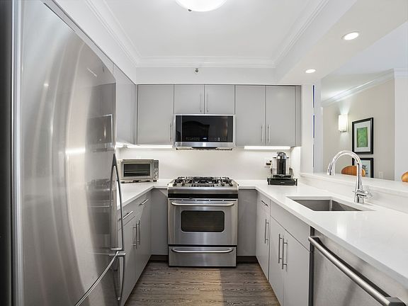 A luxurious and cosmopolitan lifestyle awaits you at The Classic! This impeccable 4th floor condo is located in the heart of vibrant downtown Stamford, only steps away from popular restaurants, shopping, entertainment and serene Mill River Park. Easy access to nearby Metro North and I-95 make this the perfect location for commuters too. From the entry, step into the charming dining room which leads to an upgraded kitchen with ample cabinetry, stainless appliances, gas stove and quartz countertops. The spacious, sun filled living room features a stunning window wall with oversized sliders opening onto a relaxing balcony. The entire residence is decorated in a tasteful palette of soothing neutral tones with richly detailed molding added for classic appeal. The bedroom wing offers a bright, airy primary bedroom with walk in closet and private bath with whirlpool bathtub and shower enhanced with limestone. The bright second bedroom located next to the hall bath with shower is just perfect as a guest room or study, in unit washer and dryer, too. Full service community amenities include: 24/7 concierge service, spa like indoor pool with dramatic skyline views and fitness center, recently renovated community club room with kitchen for social gatherings, roof top terrace and pet friendly green space area. Conveniently located and deeded garage space. Just move right in and get ready to enjoy a beautiful and carefree lifestyle! Agents see agent remarks regarding spec. assess.