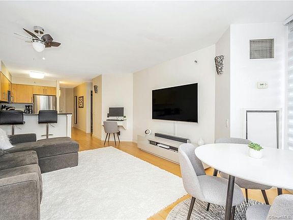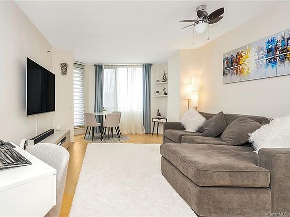 Beautiful, Manhattan-style 1BR apartment in amazing in-town location! Set above the treetops on the 9th floor with sweeping views of the city, the floor plan is open for easy living and entertaining. Updated kitchen with stainless steel appliances and granite counters and breakfast bar opening to the living room. Bamboo floors in the living area. Balcony runs the full width of the apartment, perfect for dining al fresco, entertaining, or stargazing. Other features include in-unit washer/dryer and 1 garage parking space (#30 and half of #29). Luxury building with 24/7 concierge, rooftop pool, fitness center, and grills and picnic tables on the 3rd floor. Walk to shops, restaurants, theater, and all that vibrant Downtown Stamford has to offer! Excellent financials required. First month's rent and 2 months security.