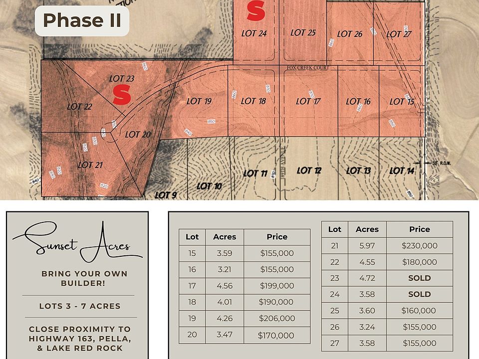 Introducing SUNSET ACRES ~ New Acreage Lots West of Pella ~ Prime Location with Scenic Views! Discover your opportunity to experience country living, minutes from downtown Pella, with these residential single family home lots! These beautiful parcels range from 3-7 acres m/l and are situated just off of Highway 163; offering both peaceful seclusion and convenient access! Enjoy stunning Sunset Views over the rolling countryside, with select lots featuring mature timber, perfect for privacy, recreation, or simply enjoy nature. Whether you're planning to build your dream home (bring your own builder), and / or want space to roam; these spacious parcels offer the flexibility and freedom to create a lifestyle you've always wanted! Don't miss this rare opportunity to own a piece of Iowa's heartland in a location that combines tranquility with accessibility! Covenants in place to protect your investment; Sunset views, spacious living, and the lifestyle you’ve been waiting for—Sunset Acres is ready to welcome you HOME!