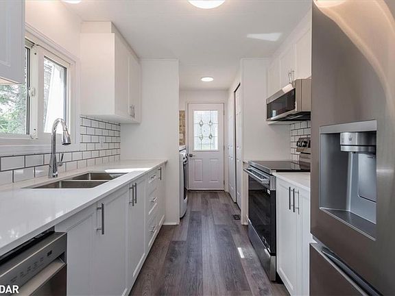 This home is sure to please. Located in the vibrant adult community of Sandycove Acres South. This bright and spacious renovated 2 bedroom, 1+1 bath Argus model has a large family room with a gas fireplace and walk out to the deck. The flooring has been updated with quality vinyl plank throughout the entire home with no transitions and the walls are painted in a bright neutral white. The galley style kitchen has been totally updated with new cupboards, quartz countertops, undermount sink with faucet and tiled backsplash. New stainless-steel stove, refrigerator, dishwasher and built in microwave. The bathrooms have also been totally updated with new vanities, sinks, taps, mirrors, lighting and the main bathroom has a new walk-in shower with soft close glass doors. This home is move in ready with newer gas furnace and central air conditioner, windows (2013), shingles (2010) and back deck with steps (2024). The laundry area next to the kitchen has white side by side washer and dryer with storage above and a large pantry closet. Private side by side 2 car parking with level access to the front door and convenient access to the side door. Sandycove Acres is close to Lake Simcoe, Innisfil Beach Park, Alcona, Stroud, Barrie and HWY 400. There are many groups and activities to participate in along with 2 heated outdoor pools, 3 community halls, wood shop, games room, fitness centre, and outdoor shuffleboard and pickle ball courts. New lease fees are $855.00/mo lease and $161.45 /mo taxes. Come visit your home to stay and book your showing today.