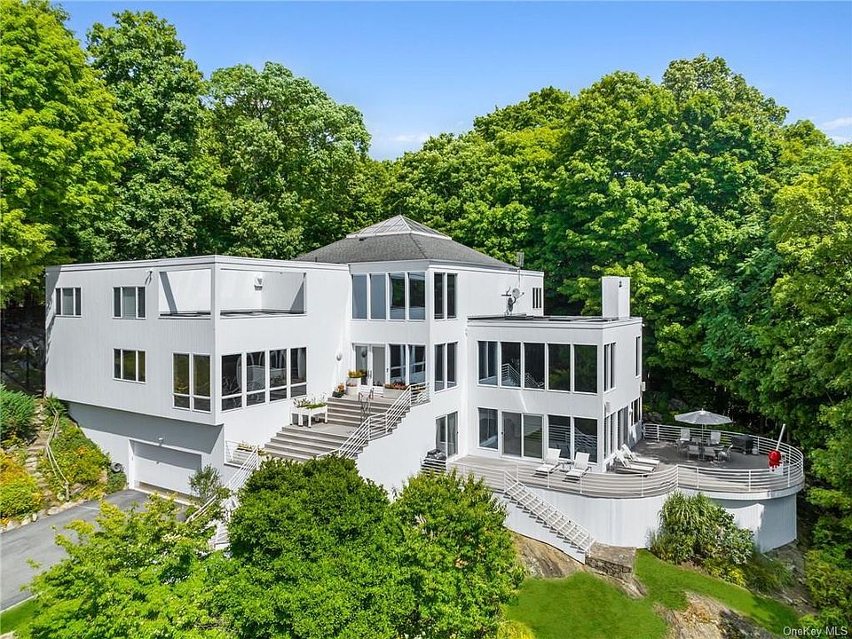 Located at the end of a culdesac up a gated drive in the award winning Chappaqua school district, this unique, dramatic light filled architect designed masterpiece, available furnished, offers 8000+ sq ft on 3+ acres. This 6 BR/6.1 bth home has soaring ceilings, floor to ceiling windows, gleaming oak flrs, extensive built-ins, high end finishes, & a practical easy-living floorplan. Top of the line expansive EIK w wood/granite/SS, walk-in pantry, & ample storage. Hilltop views complement the Living Rm/FPL, Dining Rm, 2 Home Offices, Mud Rm & Family Rm/FPL on the main level. A luxurious primary suite w dual WIC, spa style on trend Primary Bth, 3 addt'l BRs w custom built-in & en-suite baths & a skylit landing complete the 2nd flr. Wrap around windows, skylights, extensive built-ins, & motorized shades are everywhere. The LL includes an oversized Playroom/Rec Rm, Deck, Guest BR, full Bath & Wine Cellar w Tasting Rm. A flat play yard & flowering perennial beds highlight the property,