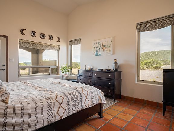 Fully fenced, A2 zoned property on 2.3-acres, 5-minute drive from Sedillo Hill exit. Met with a lush courtyard boasting hand carved columns, this open concept floorplan features radiant heat saltillo tile flooring, cathedral ceilings, and large JELD-WEN windows throughout. Spacious kitchen with granite counters and two-tone custom cabinetry, large corner pantry, touchless faucet, stainless steel appliances, and a reverse osmosis system, is sure to inspire your inner chef, and is pre-wired for a built-in convection oven. Spanish-inspired bathrooms showcase hand-painted tiles, sinks, and unique mirrors. The expansive covered patio, accessible from both the master and guest bedrooms offer indoor-outdoor living. Full RV hookup with 30 amp and clean outs on Entranosa water and PNM.