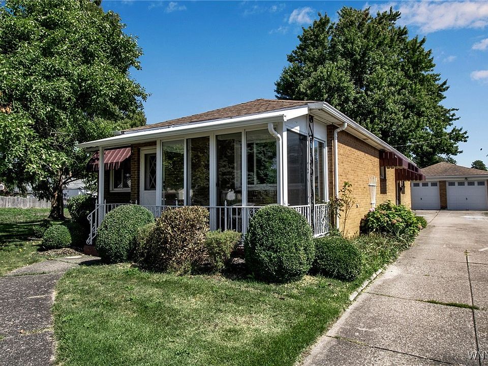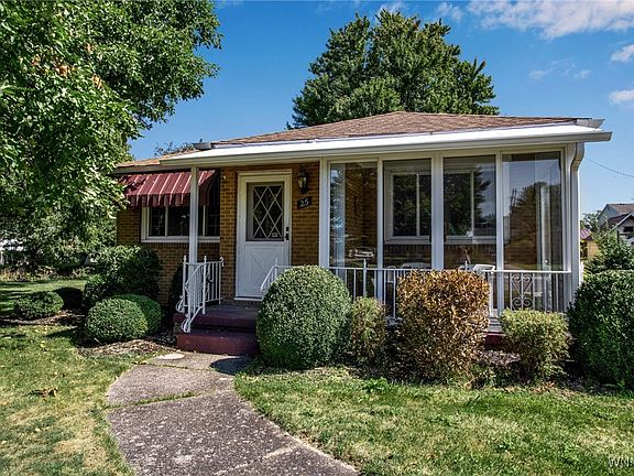 Welcome to 25 Kilbourne Rd. This is THE PERFECT starter home, or home to downsize in. Located on a quiet dead end street with no neighbors to your left but a peaceful and serene view of Scajaquada Creek. Outside you'll see this ranch is all brick, with a newer enclosed front porch, a concrete driveway and a 2 car cinder block garage. Inside you have a classic Cheektowaga ranch layout with a large eat in kitchen, a formal living room and dining room with original oak hardwood floors, and solid wood trim from 1955 as well as 3 good sized bedrooms. Also, we love ranch basements because you could double your square footage! Full basement with half bath and bar. The house also has replacement windows throughout, Forced air high efficiency furnace plus a/c.