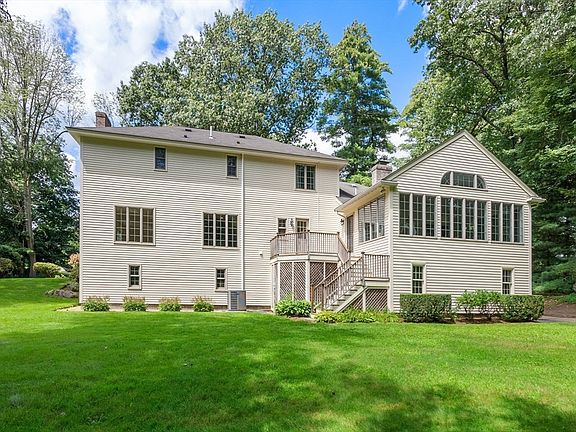 Nestled on 2.35 picturesque acres, this exquisite colonial will captivate the most discerning buyer. The front to back living room with fireplace and formal dining room are ideal for hosting memorable gatherings. The family room with vaulted ceiling boasts a dramatic brick fireplace and is adjacent to an expansive eat in kitchen with huge island and white cabinets, French doors open from the kitchen to a delightful sunroom that extends to a deck and the beautifully landscaped backyard. Upstairs, the primary is a tranquil retreat with a spacious walk-in closet and a luxe ensuite bath. Three additional bedrooms and a family bath complete the second level. The lower level provides a play area, gym, ample storage, and a cedar closet. There are hardwood floors and Central AC throughout plus a 3-car garage. 2024 roof. Located in a coveted cul de sac neighborhood, this home is close to the Rail Trail, miles of conservation, the Town Center, top ranked Weston schools, & major commuting routes.