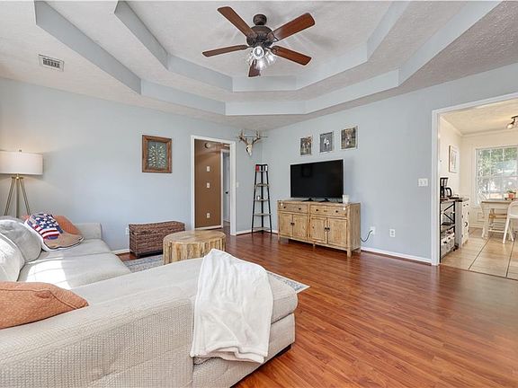 This 4-bedroom, 2-bath home features a desirable split floor plan and stylish details, including a double tray ceiling in the living room and durable LVP flooring throughout. The bright and airy primary suite offers generous space, a decorative a tray ceiling, and a private ensuite bath with plenty of counter space. Across the living room, three additional bedrooms and a full hall bath provide plenty of room for family, guests, or a home office. The kitchen includes ceramic tile, an eat-in dining area, and convenient access to the laundry room, located just off the attached 2-car garage.