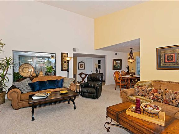 In Rancho Las Palmas community- Plan 30 Model. Beautiful 3 bedroom, 2 bathroom end unit. Features relaxing atrium, granite tile countertops, newer cabinets with new appliances. Big tile/carpet flooring, big base board, recessed lighting, & new custom window coverings along with windows shutters. Each bathroom has been custom designed with travertine vanity counter tops & floor to ceiling travertine showers. The patio shows off a private outdoor kitchen with built in BBQ, 2 burner cooktop, mini fridge & direct access from the kitchen to the patio. The garage boasts a fully insulated garage door, epoxy flooring, built in cabinetry, & tankless water heater. On a small peaceful street with views of the north side 5th hole. Walking distance from the River & historic Omni Rancho Las Palmas resort. Minutes from El Paseo and College Of The Desert Street Fair. Active community features golf, tennis and bocce ball courts.