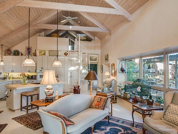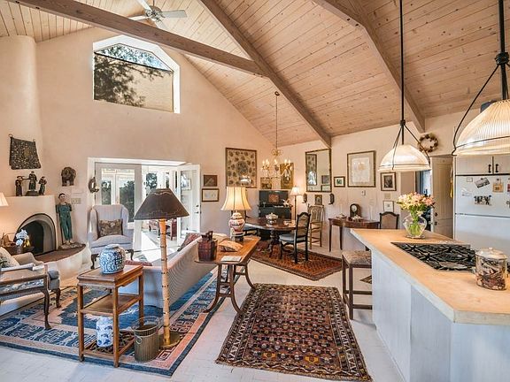 Privacy and views abound at this wonderful gated and private country home. The entrance foyer leads to the master family room, dining area and kitchen all overlaid by a cathedral type ceiling with beautiful wood beams. Accessed from this area via a spiral staircase is the perfect and private office space with vaulted ceilings. The hallway at the base of the stairs leads to the secluded and private master suite at the end of the home as well as the expansive living room, suitable for entertaining with a wet bar and access to the wrap around deck. Whether your pleasure is to sit at the outdoor fireplace and enjoy the expansive views or overlook the Koi pond you will inevitably be in heaven. This fabulous home includes an art studio/craft room. A guest Hogan is situated on the westernmost part of the lot and is accessed by a bridge built across the arroyo to a wrap around deck . With a full kitchen, heating and electricity this makes a suitable retreat for working out, painting or whatever the imagination conjures up. The 5.664 acres is very suitable for horses and provides easy access to the Galisteo Basin Preserve for a day of horseback riding, mountain biking or hiking with the dogs.