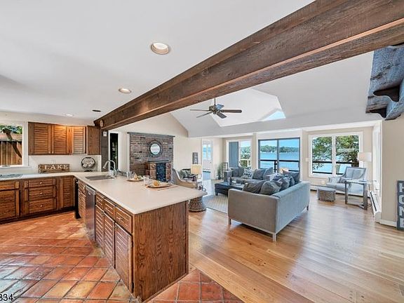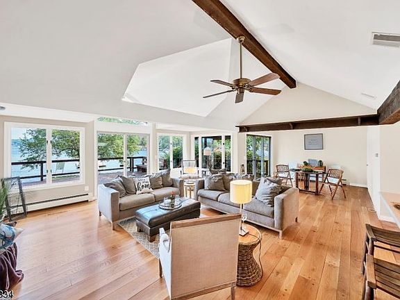 1st floor living. Open floor plan, extensive views over deck to lake! Level lot, 70ft dock. 3 bed rm, 2 updated baths, hardwood flooring, new carpet. 2nd floor bonus rm & loft. JUST UNPACK & enjoy! Eat-in kitchen, wood cabinetry & breakfast bar opens to great rm living/dining combo over wood plank flooring. Great rm hosts pellet stove, a wall of windows with french sliders that lead to 48 x 15 deck. Two first floor bedrooms & new full baths. Master suite with bonus loft for office. 3rd bedroom designed for fun with two pull out built in drawers for single beds, open floor space for recreation play area & knee wall closet storage. Oversized attached garage could be converted to additional living space. Professional landscape on level lot. Beach club community. Hike, bike fish, swim! Immediate occupancy