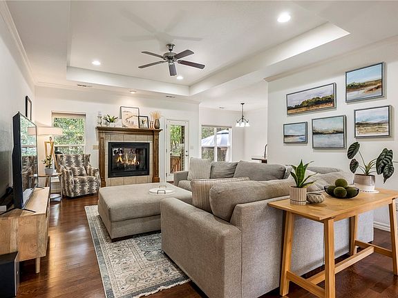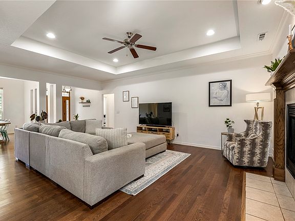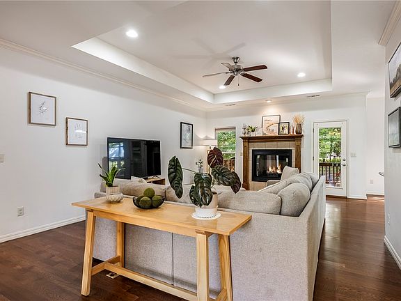 Walking distance to the Metfield Clubhouse and golf course, and just a short drive to Downtown Bentonville! The spacious living room features engineered hardwood floors, a tray ceiling, crown molding, a cozy gas fireplace, and an open floorplan filled with natural light. The large kitchen offers abundant storage, expansive counter space, and an eat-in area that flows seamlessly into the living room. A stunning formal dining room highlights crown molding, bright windows, and easy access to the kitchen, perfect for entertaining. The generous primary suite includes a spa-like bath with double sinks, a jetted tub, walk-in shower, and oversized walk-in closet. A convenient utility room provides plenty of storage, and the oversized garage offers additional space. Outdoors, relax on the covered deck or gather on the extended patio with pergola, all overlooking the beautiful, tree-filled surroundings.