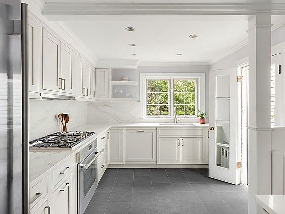 A columned entry porch leads into a gracious foyer and den, which can also serve as a fifth bedroom. This level offers flexibility for use as bedrooms, play space or den. It includes a newly renovated full bath, and a large laundry room. From here, access the expansive 22-foot-wide rear garden, with stone patio, lush plantings, and abundant room for outdoor dining, entertaining, and gardening.