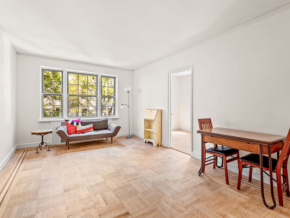 The unit offers a generous layout including a gracious entry foyer with enough room for a dining room or home office area, a spacious sunken living room, a cheerfully nenovated windowed bath, a windowed kitchen with new, never-used stainless steel gas range and dw, original hardwood floors with inlaid wood bordering, crown moldings along all ceilings, generous storage (3 closets), and windows in every room. The cozy two-windowed bedroom can accommodate a Queen bed and a dresser or wardrobe armoire.