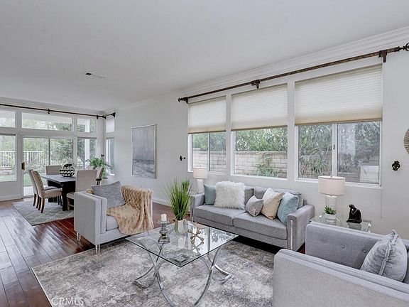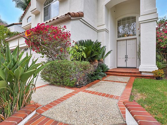 Exceptional Pacific Hills home on a large lot, ideally positioned on a single-loaded street offering greenbelt views in front and peaceful treetop vistas with peekaboo Saddleback Mountain views in back. The terraced street design provides generous side yards and comfortable spacing between homes, creating a sense of openness and privacy. This beautiful home offers a downstairs bedroom suite with private 3/4 bath. Double doors open to a grand two-story foyer! Step down to the formal living and dining rooms, filled with natural light from many large windows with views to the lush yard and greenery. The spacious kitchen opens to a large informal dining area and family room with fireplace and built-in bar, ideal for gatherings and entertaining. A peninsula provides additional seating and casual dining space. Upstairs, the expansive primary suite offers a private sitting area, view balcony, dual closets (including a walk-in), and a beautifully appointed bath with soaking tub, separate shower, and dual-sink vanity. Two additional bedrooms and a versatile loft with closet—easily convertible to a fifth bedroom—are serviced by a full hall bath with dual sinks and a tub/shower combination. Upgrades include fresh interior paint and carpet, engineered hardwood flooring, and a previously remodeled kitchen featuring upgraded cabinetry with lighted glass display shelving and granite countertops. Plantation shutters enhance select windows throughout. The backyard is a gardener’s delight, with a grassy expanse of fresh sod, mature citrus and apple trees, and many planter areas. A cement pad awaits a future fountain or custom feature, while the covered patios provide shaded areas for outdoor dining and relaxation. With plenty of room to run and play, the yard is ideal for children and pets alike. Walking distance to Newhart Middle School, the Norman P. Murray Community Center, local shopping and restaurants, and the scenic Oso Creek walking trail, residents also enjoy membership to Lake Mission Viejo, offering boating, beaches, concerts, and year-round recreation.
