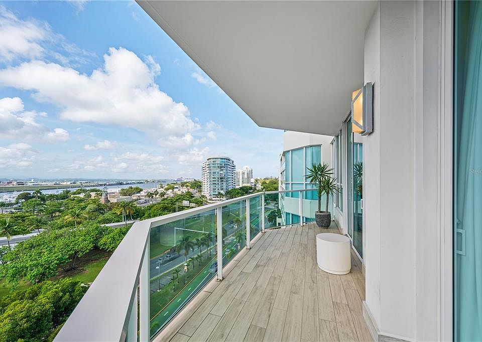 With an impeccable coastal position in the city’s Puerta de Tierra WeCo district, this eighth floor residence at Bahia Plaza is offered as a fully turn-key two bed, two and a half bath with just over 1,900 sq.ft. Featuring a spacious primary suite with a custom walk-in closet, a second en suite bedroom, and an open living and dining area that leads to a covered balcony with views to the San Juan Bay and the Convention District. Designed by Susan Keenan, the interiors reflect a clean, modern sensibility with layered textures and curated warmth. Furniture and fixtures include pieces from Serena & Lily, Stark, Bungalow 5, and Palecek, paired with a custom ivory paint palette. The kitchen has been extensively upgraded with Sub-Zero refrigeration systems, Wolf induction cooktop, Cove dishwasher, and a dedicated laundry room with Miele washer and dryer. Interiors include custom California Closets throughout, tankless water heating, upgraded Carrier HVAC, and electric window shades. A Samsung Frame TV, in-ceiling Sonos sound, and integrated lighting elevate the living spaces with ease and intention. The residence is offered fully furnished with the complete design package and select artwork. Two deeded parking spaces are included, with building amenities such as 24-hour security, full back-up generator and cistern, resident’s lounge, pool, and gym. Bahia Plaza is a contemporary, design-focused Condominium with immediate access to dining, culture, and the waterfront.