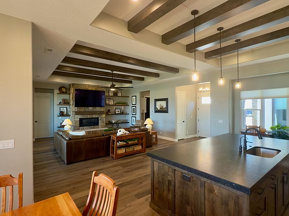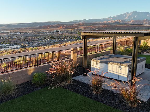 This luxury home showcases panoramic views of the valley and Pine Valley Mountain. With 5 spacious bedroom sand 4.5 baths, the ope concept layout is filled with natural light and designed for both comfort and sophistication. Exceptional craftsmanship throughout! The living room features a stunning fireplace and large sliding doors that seamlessly blend indoor and outdoor living. The gourmet kitchen is equipped with top of the line appliances, large island quartz countertops and custom cabinetry. The generous primary suite includes a spa inspired ensuite bath. Outside, the pristine backyard offers multiple awnings, low maintenance turf and a 9 person hot tub overlooking the valley. Additional highlights include a 4 car garage and direct access to the nearby bike trails.