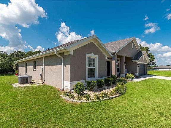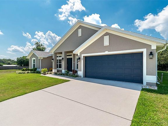 Discover one of the most private options within the gated community of St. James Park! A large retention area runs along the western and back side of the property, meaning there is abundant privacy and guaranteed green views. Accented by mature landscaping and set on a hill, the home offers plenty of curb appeal. Built in 2019, the home offers a total of 4-bedrooms and 2-full baths plus an office and formal dining room. The interiors are incredibly spacious and an open split-bedroom floor plan with high ceilings throughout. The living area features soaring cathedral ceilings and large windows for plenty of natural light, as well as direct access to the back patio. For those who enjoy spending time cooking, the kitchen is an ideal space with newer quartz countertops, custom tile backsplash, stainless steel appliances, a large breakfast bar, a built-in coffee bar in the adjacent breakfast nook, and additional pantry storage. The primary suite is an exquisite space that features an extra-large layout, tray ceilings with crown molding, direct patio access, and a recently updated en-suite bath that includes dual vanities with quartz countertops, a custom walk-in shower, and an open-air walk-in closet that runs the full length of the room. New luxury plank flooring in living room, hallway, dining room and foyer! To the back of the home is a spacious screen-enclosed lanai that offers the perfect place to relax and unwind with several ceiling fans and plenty of space for seating, plants, and everything in between. An open patio is just beyond the lanai for added options to enjoy the sunshine, and both spaces overlook a quiet green space. There is so much to discover with this home including a slew of updates that make this property a true must-see! TV in living room conveys
