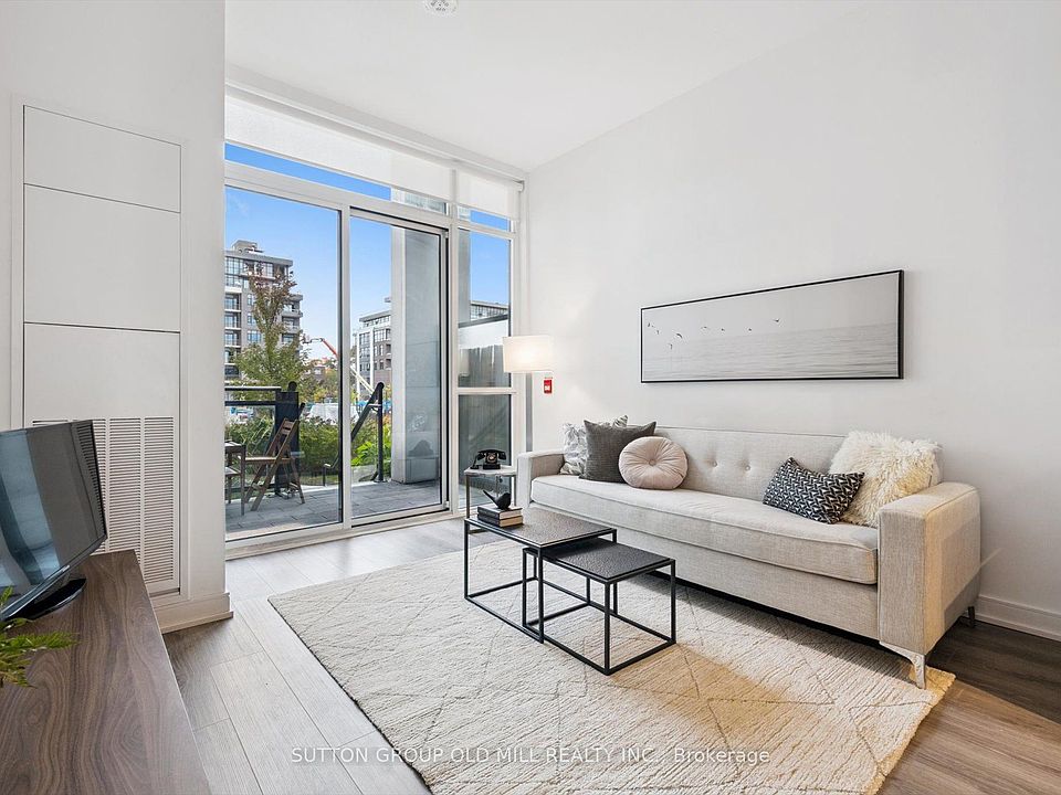 Welcome to this gorgeous terraced unit at the desirable Backyard Condos, conveniently located just north of the Queensway. Enter either via the front lobby with concierge, or directly to your unit from the courtyard through your beautiful private terrace, perfect for quiet enjoyment with a coffee or to take the dog for a quick walk. Ideal for a home cook, upgraded chef's kitchen with large island, beautifully custom shaker cabinets and stainless appliances. Comfortable living room overlooks green space while feeling private. Bedroom features large walk in closet. High ceilings throughout, ensuite laundry, parking and locker. Building features gym, dog grooming area, children's play room, party room. Right next door is a convenience store, pharmacy and health care centre, with Bell Manor Park up the road. Nearby you'll find easy access to TTC, Sobeys, lots of dining options and a short distance to the lake. Perfect for either a first time buyer or investor, this well maintained unit is a blend of urban sophistication offering a great city lifestyle in a quiet community setting.