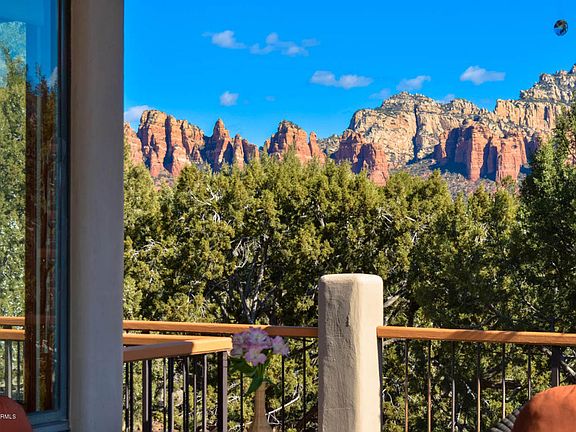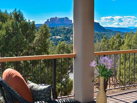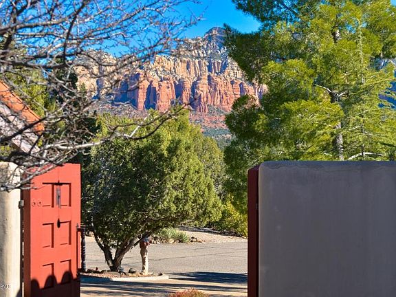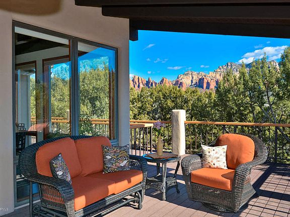 One of the most spectacular settings with panoramic 270 degree Red Rock views! Beautiful wraparound Trex decking to enjoy the famous Cathedral Rock and Twin Butte views. From the moment you enter this pavered driveway to the Spanish courtyard , you will notice this is a special property. Built with privacy and views in mind, this home offers high wood beamed cathedral ceilings with walls of glass to capture all of Sedona's famous red rocks . Spanish tile flooring and wood windows gives this home a warm feeling. Chef kitchen with huge island and large walk in pantry that would capture any cook's heart. All main living on one level with the third bedroom/bonus/media room downstairs. Enjoy your private sanctuary with your own sparkling pool and hot tub. Apricot trees. Close to creek and