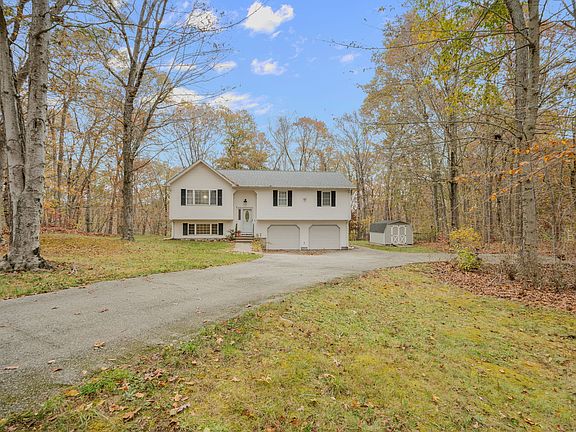 HIGHEST & BEST DUE BY MONDAY (11/3) AT 12 NOON. - It's the home you have been waiting for! Nestled at the end of a peaceful cul-de-sac and surrounded by trees, this beautifully maintained and move-in-ready residence sits back from the road offering privacy on nearly 2 acres. The spacious 3 bed, 2.5 bath home will not disappoint with its newer roof(Dec 2021), mini-split system(2023), hot tub(2022) with pull-down screen under the deck for hot tub movie nights, and fans and lighting fixtures updated within the past 4 yrs. Step inside to soaring vaulted ceilings and an open concept living & dining area, seamlessly connected to a 26x9' deck overlooking the fenced in backyard with plenty of nature. The kitchen boasts new vinyl flooring(2022), stainless appliances(2021), new kitchen sink (2023), a small convenient pantry and a large scenic window overlooking the woods. The primary suite includes two generous closets, - one a walk-in leading to a private bath. Two good sized additional bedrooms with ample closet space, another full bath, and more storage complete the main floor. Downstairs, enjoy a 20'x15' versatile finished heated space perfect for a rec room, gym, or family room, along with an updated half bath, laundry area, abundant storage, and a spacious garage with room for 2 cars and a workspace or storage. A whole house generator hook up is located on the side of the home, as well as a new shed (2022)! Close to Ledyard schools & major employers.