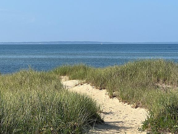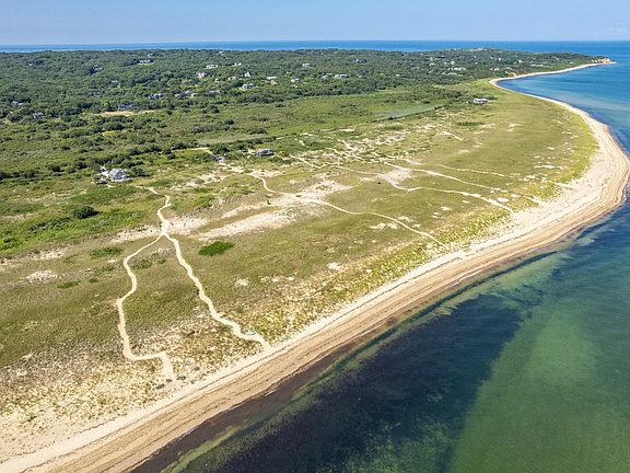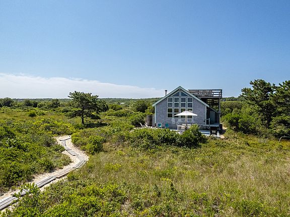 Vineyard Sound waterfront! This is what summer on the Vineyard is all about. Contemporary beach house set in the dunes on 4.6 acres amongst beach plum bushes and windswept beach grass. Open concept interior with a wall of windows facing the Vineyard Sound and Elizabeth Islands. Two guest rooms on the main level and a top floor primary bedroom with deck for star gazing and glorious sunsets. A boardwalk leads to the 265' private beach for swimming, kayaking and beachcombing.