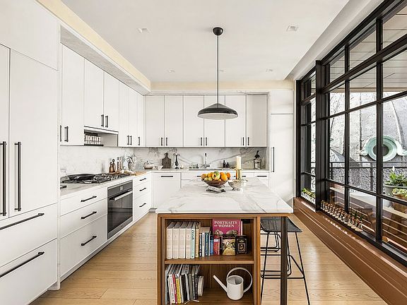Living and entertaining spaces are framed by oversized casement windows that capture multiple exposures, including Hudson River sunsets to the west and midtown’s towers to the north. A 190 SF loggia, accessed directly from the living and dining room, extends the living space outdoors. Inside, wide-plank Italian oak flooring, 9" decorative mouldings, and a dramatic open kitchen set the tone. The kitchen features a cantilevered island with custom cabinetry and shelving, Calacatta Gold marble countertops and backsplash, and a full suite of Miele appliances—including panel-concealed refrigerator and freezer, five-burner gas cooktop with vented hood, speed oven, full-size oven, and wine refrigerator.